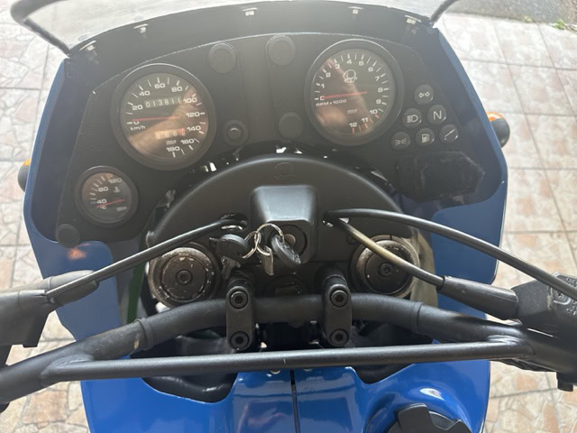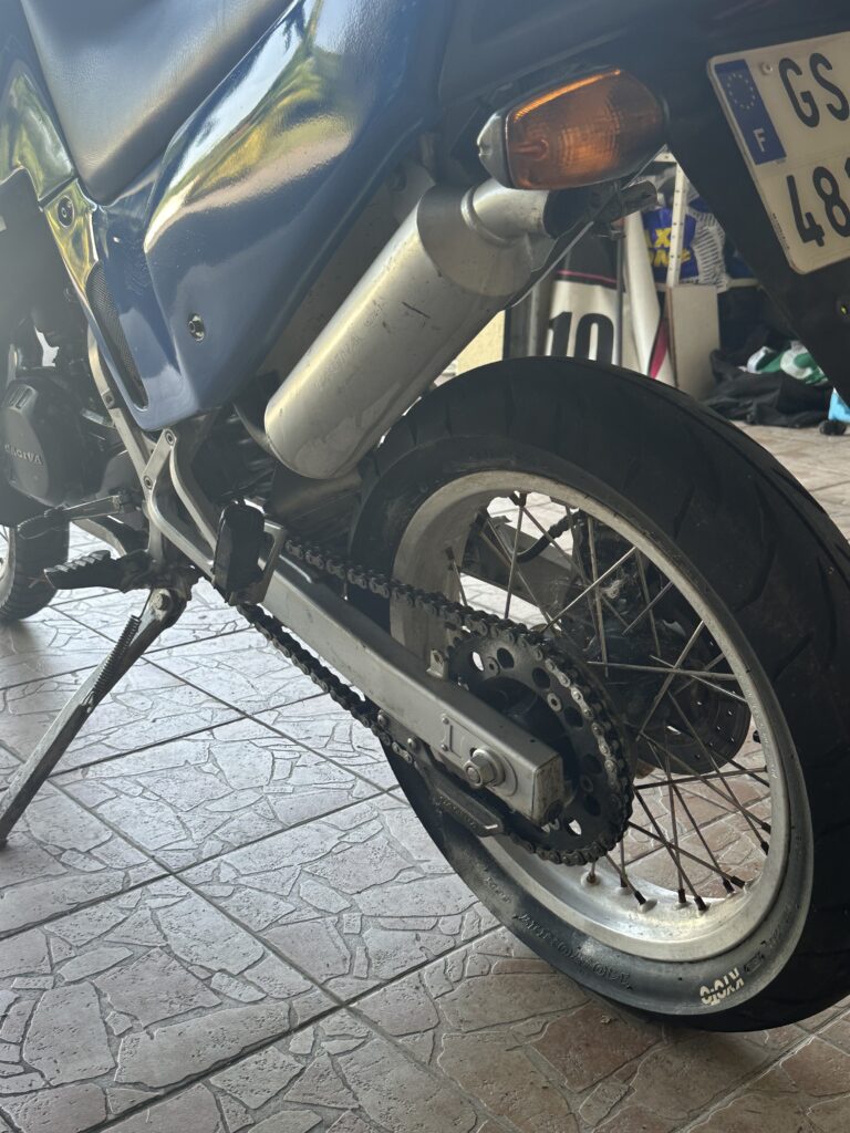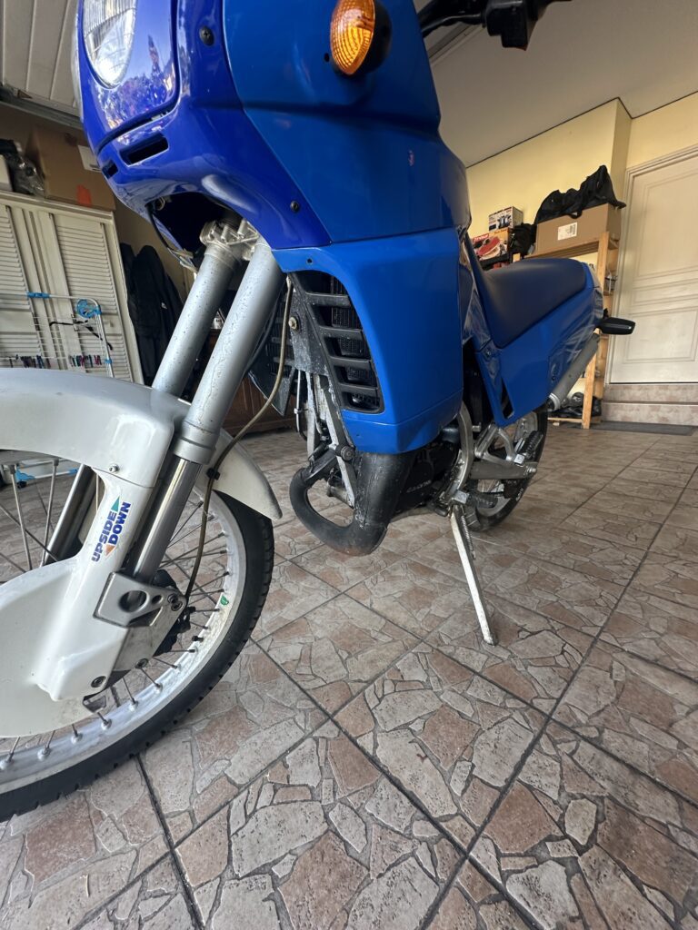 Il va y avoir du boulot : il manque des pièces d’habillage, certains sont cassées, points de rouille, elle pise l’huile et l’essence (durites), freinage anecdotique (à se demander comment elle a pu avoir le CT !), pneu enduro devant / route à l’arrière, pièces repeintes à l’arrache à la bombe en cache misère, etc. Mais le moteur tourne, et plutôt bien !