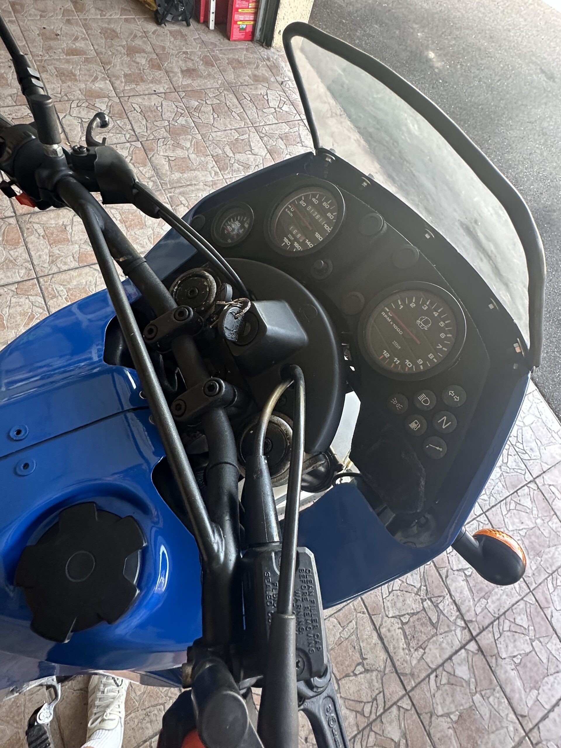 Il va y avoir du boulot : il manque des pièces d’habillage, certains sont cassées, points de rouille, elle pise l’huile et l’essence (durites), freinage anecdotique (à se demander comment elle a pu avoir le CT !), pneu enduro devant / route à l’arrière, pièces repeintes à l’arrache à la bombe en cache misère, etc. Mais le moteur tourne, et plutôt bien !