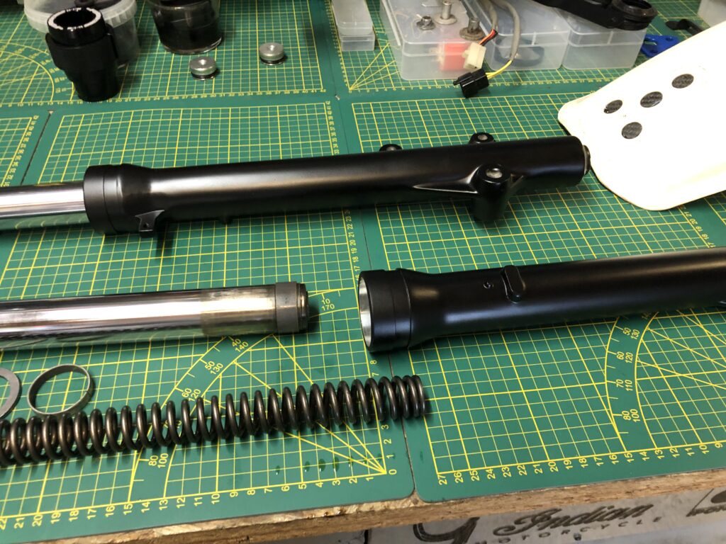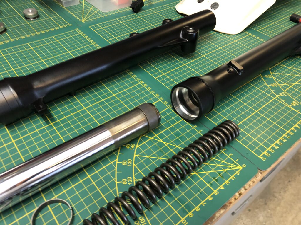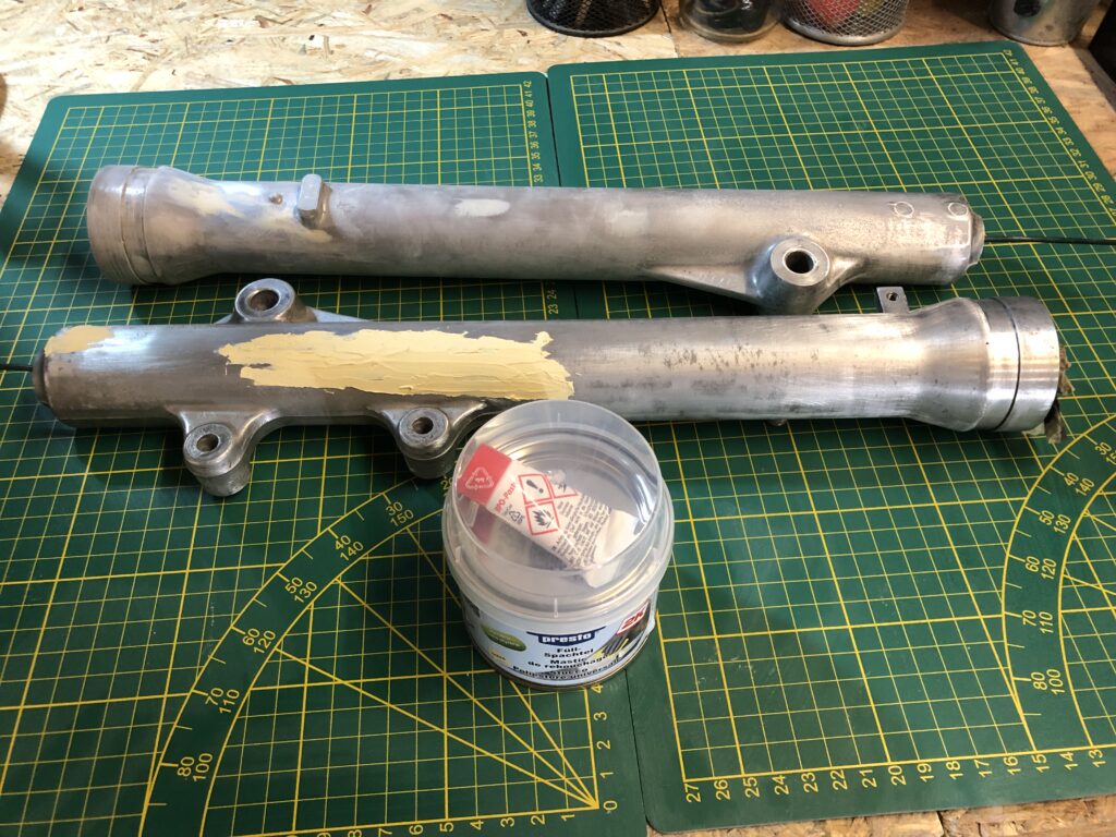 Pour les tubes de fourches, j’ai là encore utilisé les produits disponibles chez peinturemoto.fr. les tubes étaient marqués, je les ai donc rattrapé avec un mastic spécial alliage, puis ponçage, apprêt, ponçage, apprêt, ponçage… Jusqu’à obtenir une surface parfaite. Je suis ensuite partie sur une peinture spécifique pour fourche mais de couleur noire pour coller à l’esprit de la restauration que je souhaite.