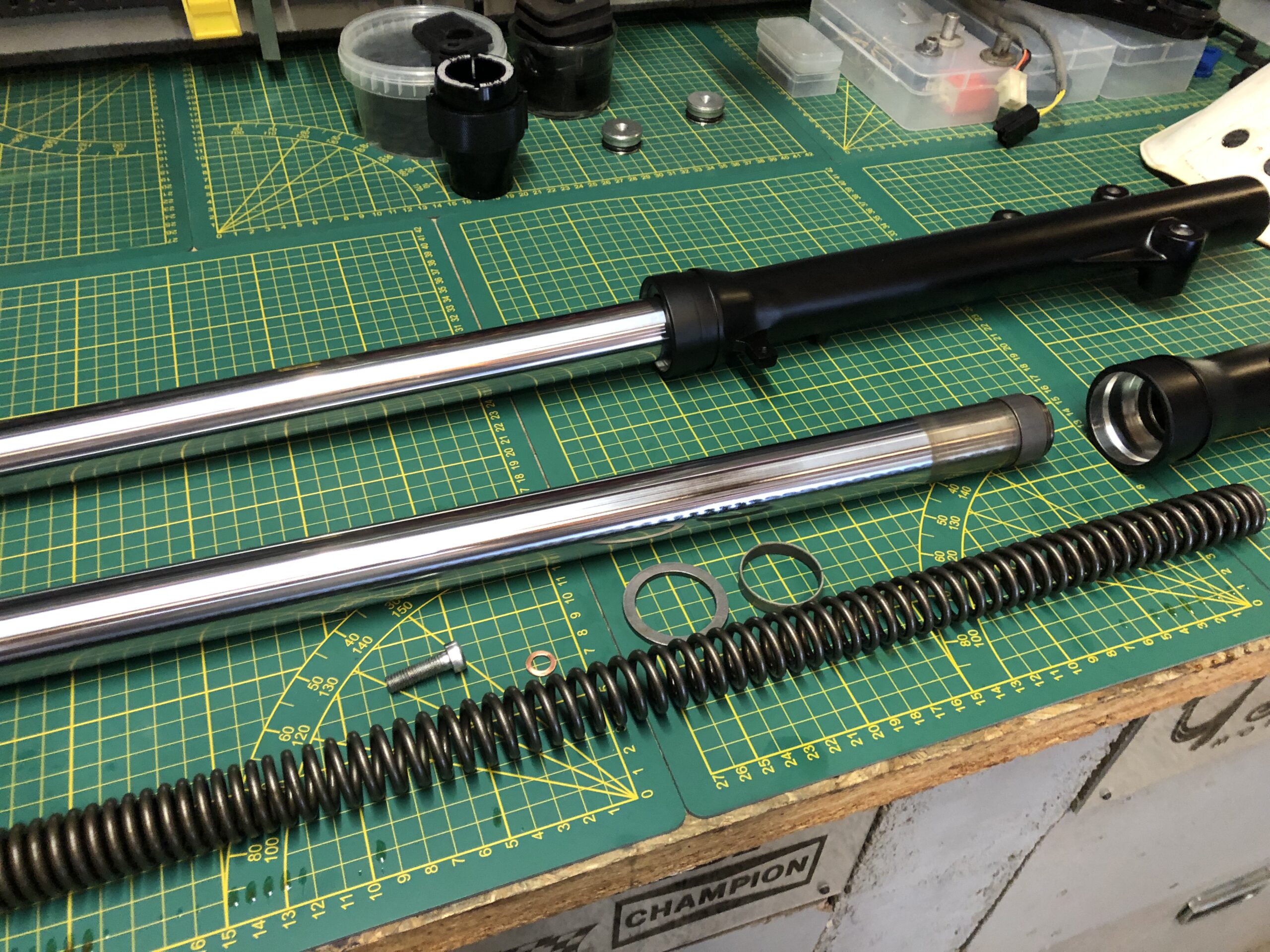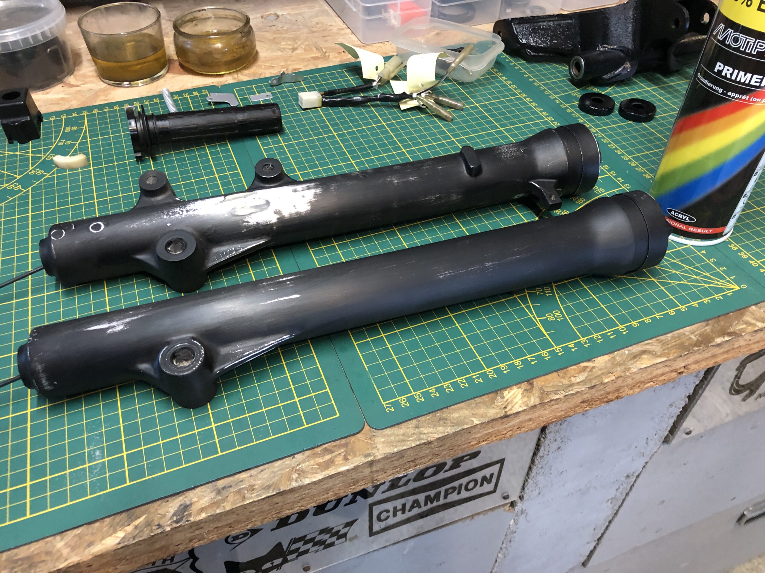 Pour les tubes de fourches, j’ai là encore utilisé les produits disponibles chez peinturemoto.fr. les tubes étaient marqués, je les ai donc rattrapé avec un mastic spécial alliage, puis ponçage, apprêt, ponçage, apprêt, ponçage… Jusqu’à obtenir une surface parfaite. Je suis ensuite partie sur une peinture spécifique pour fourche mais de couleur noire pour coller à l’esprit de la restauration que je souhaite.